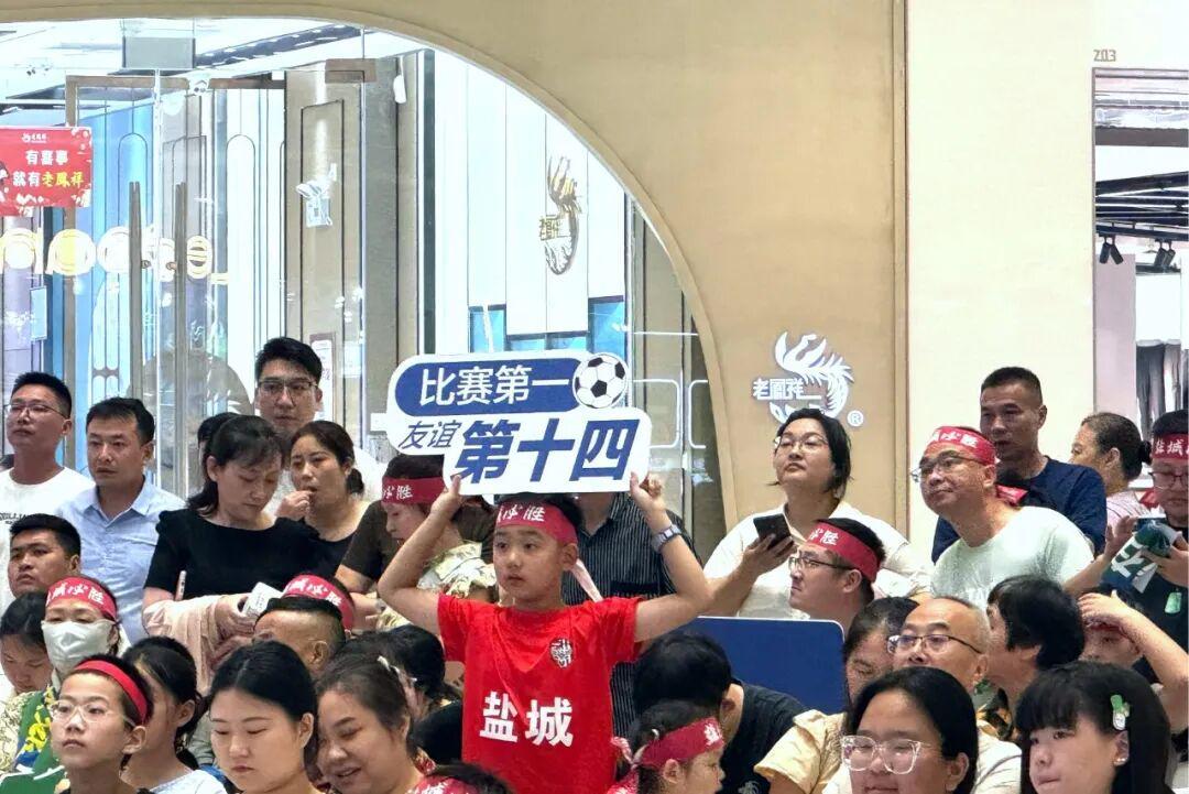 吾悦广场的观赛区同样气氛火热。巨大的LED屏幕将赛场上的每一个精彩瞬间清晰呈现,球迷们头戴应援横幅,呐喊声、助威声此起彼伏。“加油,盐城队!”的呼喊声在广场上空回荡,仿佛要将整个城市的热情点燃。