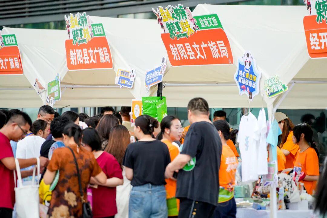 “今天我们带来了射阳特色文创冰箱贴,上面印着日月岛、泊心黄沙港、安徒生童话乐园这些标志性景点,另外还准备了苏超主题文创,特别受小朋友喜欢。” 日月岛康养旅游度假区讲解员曹昕仪一边整理摊位,一边热情介绍。